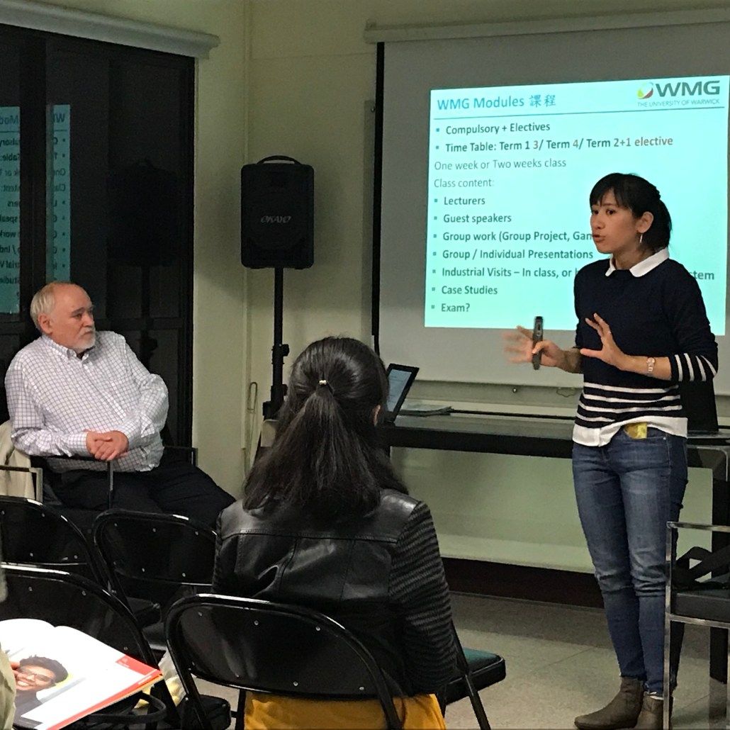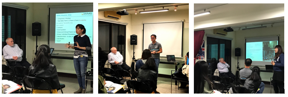 很高興來跟在場聽眾分享我在WMG上課的課程內容,我學的是關於供應鏈管理相關,課程主要分為9-10區塊,其中7門必修2門選修,以授課式學習為主,WMG學院課程跟其他碩士課程很不一樣的地方在於,請來業界工作人士擔任講師,讓學生可以吸取業界實務資訊,通常一班約30個人左右,學生會參與很多小組討論跟遊戲,跟玩桌遊有點類似,因此上課內容對學生來說是相當有趣的;另外,校方也有很多活動,像是安排學生至巧克力、印度香料、起司…等跟供應鏈相關的工廠參觀,例:amazon英國物流廠。在寫報告方面,通常需要1個月左右的時間,課堂也有很多workshop工作坊,而課程的助教也很貼心,學生在上課之前,會拿到助教為同學整理好上課的所有資料;華威大學在提供資源設備協助這塊,做得很豐富也很完善,資訊中心有開設很多工作坊,教授各式各樣資訊軟體的課程和學習。 最令我感到很溫暖的,莫過於每個學生都有personal tutor (個人專屬導師),無論生活週遭大小事情(像是私人請假)都能為學生協助,關於寫論文方面,學校也有寫作導師協助指導學生,給予建議,我也建議盡可能提早進行安排準備,與助教討論研究方向,最後想勉勵未來有機會出國的在場聽眾,在異地不懂的事情要勇於發問,大家都很友善不用擔心,另外要勉勵自己要堅強、樂觀,並相信自己一定可以達到。